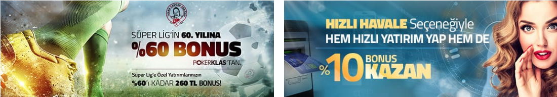 Kaçak bahis sitelerinde verilen bonuslar aynı zamanda sitenin kalitesini de belirlemektedir. Pokerklas sürekli güncellediği promosyon kampanyaları sayesinde kullanıcılarının bakiyelerine destek olmaktadır. Bu da bahis severlerin Pokerklas’ ta geçirdiği vaktin artmasını sağlamaktadır. Pokerklas bonus kampanyaları; %100 Hoş Geldin Casino Bonusu, Casino ve Canlı Casino %10 Yatırım Bonusu, %10 Haftalık Casino Kayıp Bonusu, %50 Spor Bahisleri Hoş Geldin Bonusu, Türkiye Süper Lig 60. Sezon Kapanışa Özel %60 Bonus, Hızlı Havale Yatırım Bonusu, %15 Sanal Kart Yatırım Bonusu, %50 QR Kod Hoş Geldin Bonusu ve %20 Cep Bank – QR Kod Yatırım Bonusu’ ndan oluşmaktadır. Pokerklas’ ın bonus kampanyalarının şartlarında değişikliğe gitme hakkı bulunmaktadır. Bonus şartlarını takip etmek ve kazanılan bonusları siteden talep etmek tamamen kullanıcıların gözetimindedir.